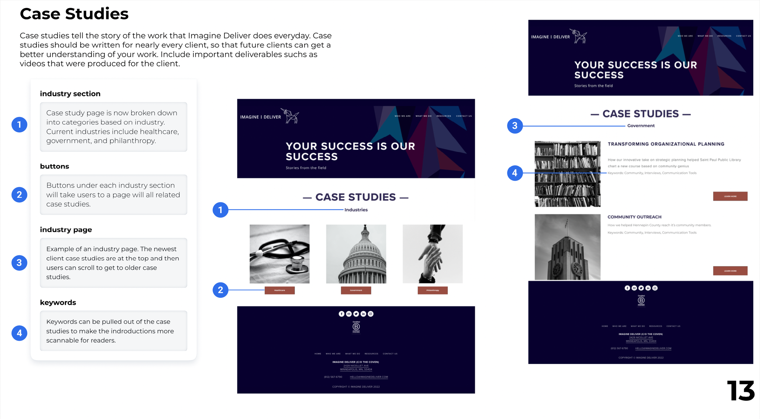 High fidelity prototypes were developed for each touchpoint. One major focus was the redesign of the case studies page. This page was influenced by the research from the competitive audit. It was found that larger consulting companies had case studies written for nearly every client. Those case studies were then organized based on industry.
